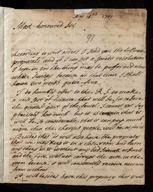 Details of a furnace which does not produce smoke or smell and draws in clear air to the room; wishes to construct it for the Society at Gresham College