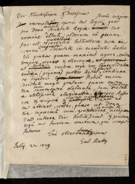 William Rutty, William Rutty, Letter, from William Rutty to Mr Wolf, 22 July 1729, EL/R2/24, The Royal Society Archives, London, https://makingscience.royalsociety.org/items/el_r2_24/letter-from-william-rutty-to-mr-wolf, accessed on 08 February 2026