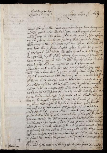 Robert Southwell, Sir; Robert Southwell, Letter, from Robert Southwell to Henry Oldenburg, dated at Lisbon, 16 March 1669, EL/S1/21, The Royal Society Archives, London, https://makingscience.royalsociety.org/items/el_s1_21/letter-from-robert-southwell-to-henry-oldenburg-dated-at-lisbon, accessed on 11 March 2026