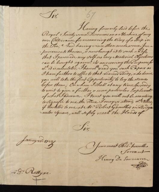 Henry de Saumarez, Letter, from Henry de Saumarez to William Rutty, 23 January 1729, EL/S2/67, The Royal Society Archives, London, https://makingscience.royalsociety.org/items/el_s2_67/letter-from-henry-de-saumarez-to-william-rutty, accessed on 07 February 2026