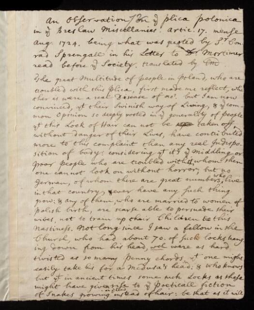 Observations of the hair condition 'plica polonia' in Poland from an article to the Society of Breslau, EL/S2/72, The Royal Society Archives, London, https://makingscience.royalsociety.org/items/el_s2_72/observations-of-the-hair-condition-plica-polonia-in-poland-from-an-article-to-the-society-of-breslau, accessed on 10 April 2026