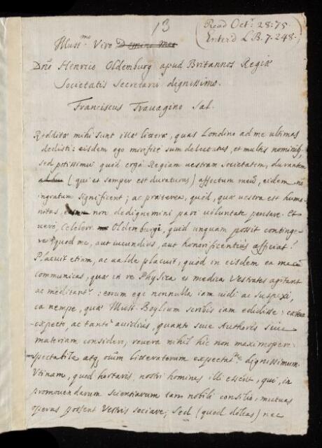 Francesco Travagino, Francesco Travagino, Letter, from Francisco Travagino to Henry Oldenburg, dated at Venice, 26 June 1675, EL/T/13, The Royal Society Archives, London, https://makingscience.royalsociety.org/items/el_t_13/letter-from-francisco-travagino-to-henry-oldenburg-dated-at-venice, accessed on 19 April 2026