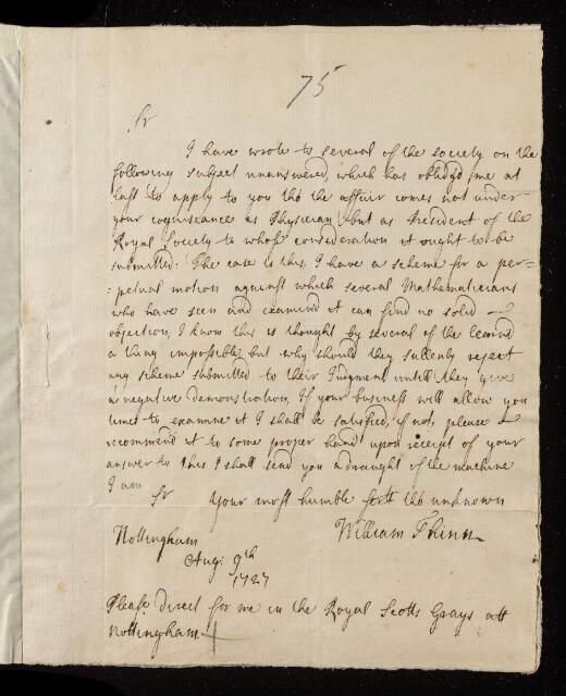 William Thinn, Letter, from William Thinn to Hans Sloane, dated at Nottingham, 09 August 1727, EL/T/75, The Royal Society Archives, London, https://makingscience.royalsociety.org/items/el_t_75/letter-from-william-thinn-to-hans-sloane-dated-at-nottingham, accessed on 10 November 2025