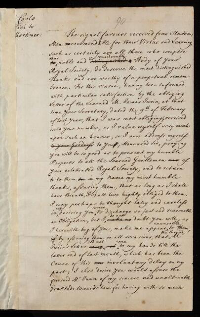 Translation of a letter, from Carlo Taglini to Cromwell Mortimer, dated at Pisa