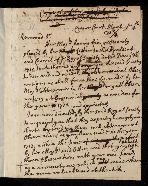 Richard Waller, Richard Waller, Copy of a letter, from Richard Waller to John Flamsteed, dated at Crane Court, 04 March 1714, EL/W3/81, The Royal Society Archives, London, https://makingscience.royalsociety.org/items/el_w3_81/copy-of-a-letter-from-richard-waller-to-john-flamsteed-dated-at-crane-court, accessed on 15 January 2026