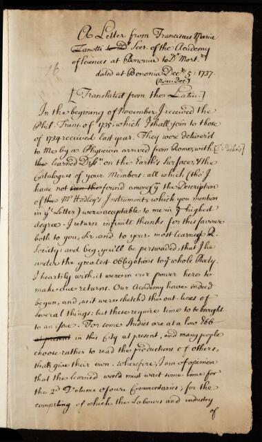 Francesco Maria Zannotti, Francesco Maria Zanotti, Translation of a letter, from Francis Maria Zanotti to Cromwell Mortimer, dated at Bologna, 01 January 1737, EL/Z/16, The Royal Society Archives, London, https://makingscience.royalsociety.org/items/el_z_16/translation-of-a-letter-from-francis-maria-zanotti-to-cromwell-mortimer-dated-at-bologna, accessed on 14 November 2025