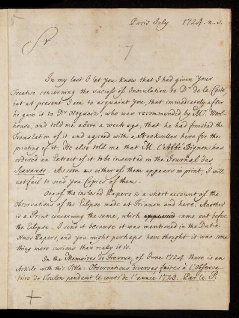 Philip Henry Zollman, Philip Henry Zollman, Letter, from Philip Zollman to James Jurin, dated at Paris, 01 July 1724, EL/Z/7, The Royal Society Archives, London, https://makingscience.royalsociety.org/items/el_z_7/letter-from-philip-zollman-to-james-jurin-dated-at-paris, accessed on 08 November 2025