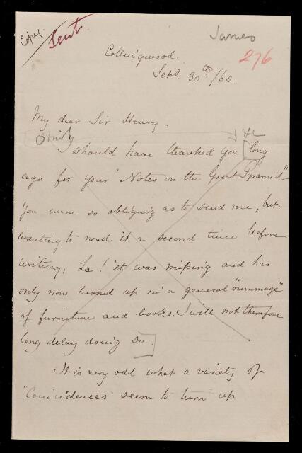 Copy of a letter. Regrets delay in acknowledging his Notes on the Great Pyramid; it was due to a temporary loss of the work. Finds Henry James's theory on the inclination of the passages very practical. Comments on the accuracy of the pyramid builders.
