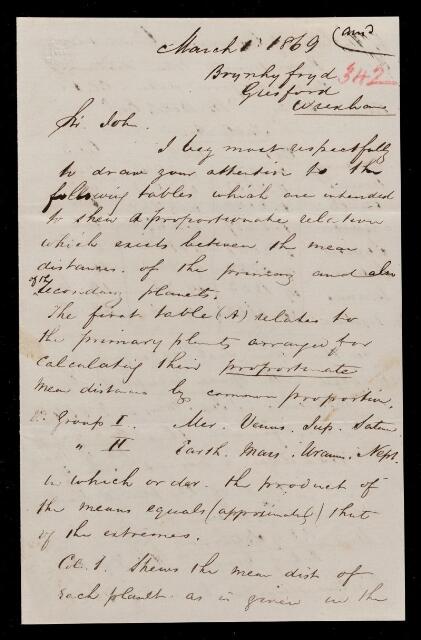 John Jones, Letter, from J[ohn] Jones to Sir John Herschel, dated at Brynhyfryd, Wrexham, 1 March 1869, HS/10/342, The Royal Society Archives, London, https://makingscience.royalsociety.org/items/hs_10_342/letter-from-john-jones-to-sir-john-herschel-dated-at-brynhyfryd-wrexham, accessed on 15 April 2026