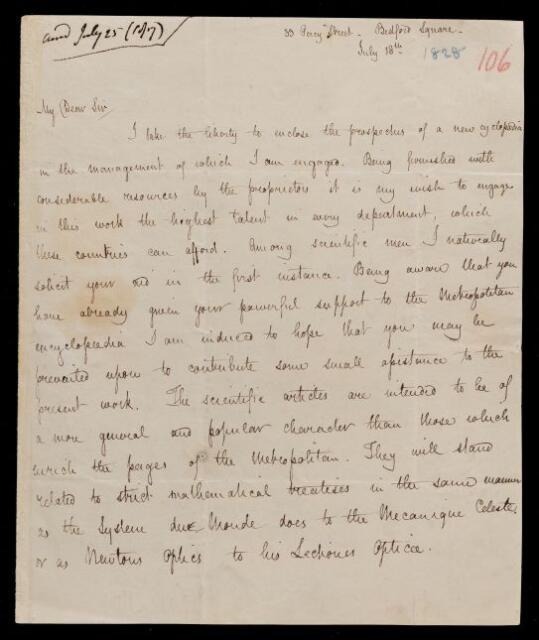 Autograph letter signed by sender. Is engaged in preparing a new popular cyclopaedia, and would be pleased if John Frederick William Herschel would contribute an article on Light.