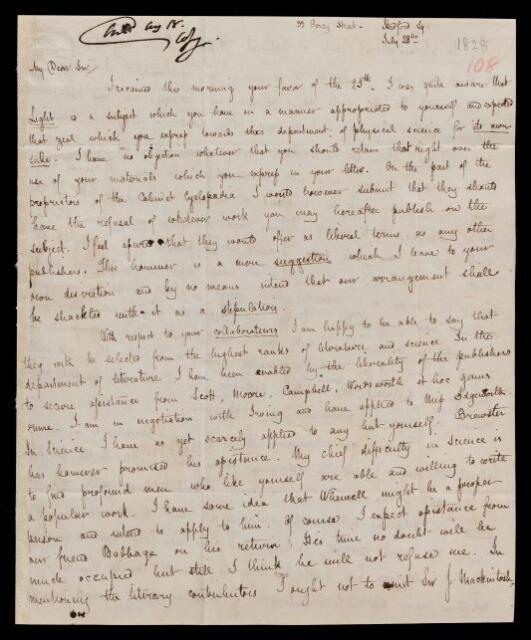 Dionysius Lardner, Letter, from Dionysius Lardner to Sir John Herschel, dated at 33 Percy St., Bedford Square, 28 July 1828, HS/11/108, The Royal Society Archives, London, https://makingscience.royalsociety.org/items/hs_11_108/letter-from-dionysius-lardner-to-sir-john-herschel-dated-at-33-percy-st-bedford-square, accessed on 17 March 2026