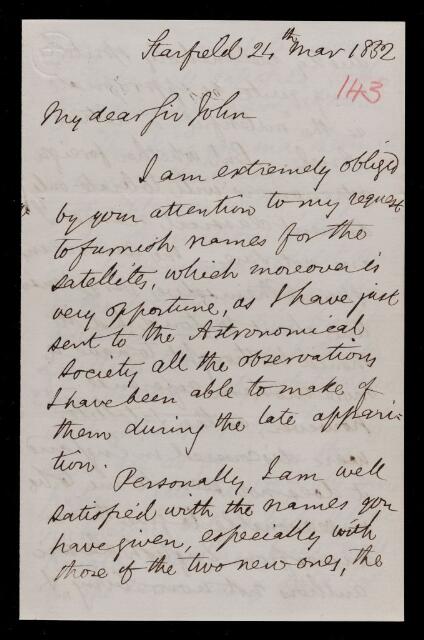 William Lassell, Letter, from William Lassell to Sir John Herschel, dated at Starfield, Liverpool, 24 March 1852, HS/11/143, The Royal Society Archives, London, https://makingscience.royalsociety.org/items/hs_11_143/letter-from-william-lassell-to-sir-john-herschel-dated-at-starfield-liverpool, accessed on 15 January 2026