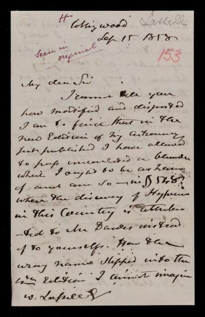 John Frederick William Herschel, Sir; John Frederick William Herschel, Draft letter, from Sir John Herschel to William Lassell, dated at Collingwood, 15 September 1858, HS/11/153, The Royal Society Archives, London, https://makingscience.royalsociety.org/items/hs_11_153/draft-letter-from-sir-john-herschel-to-william-lassell-dated-at-collingwood, accessed on 16 November 2025