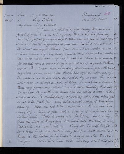 John Frederick William Herschel, Copy letter, from Sir John Herschel to Harriet Lubbock, dated at Collingwood, 15 June 1865, HS/11/353, The Royal Society Archives, London, https://makingscience.royalsociety.org/items/hs_11_353/copy-letter-from-sir-john-herschel-to-harriet-lubbock-dated-at-collingwood, accessed on 05 December 2025