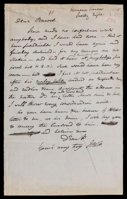 Autograph letter signed by sender. A note to George Peacock accompanying a letter to Augustus Frederick (Duke of Sussex) in which John Frederick William Herschel indicates a change of heart and an acceptance of the baronetcy [see John Frederick William Herschel's 1838-6-19].