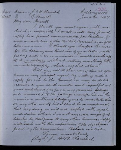 Copy letter, from Sir John Herschel to George Peacock, dated at Collingwood