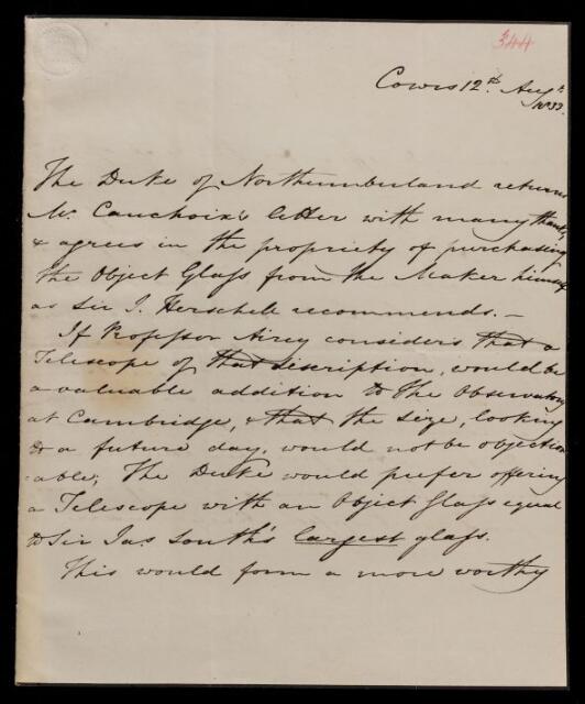 Hugh Percy, Letter, from Hugh Percy (3rd Duke of Northumberland) to Sir John Herschel, dated at Cowes, 12 August 1833, HS/13/344, The Royal Society Archives, London, https://makingscience.royalsociety.org/items/hs_13_344/letter-from-hugh-percy-3rd-duke-of-northumberland-to-sir-john-herschel-dated-at-cowes, accessed on 13 March 2026