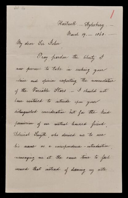Norman Robert Pogson, Letter, from Norman Pogson to Sir John Herschel, dated at Hartwell, Aylesbury, 17 March 1860, HS/14/1, The Royal Society Archives, London, https://makingscience.royalsociety.org/items/hs_14_1/letter-from-norman-pogson-to-sir-john-herschel-dated-at-hartwell-aylesbury, accessed on 14 March 2026