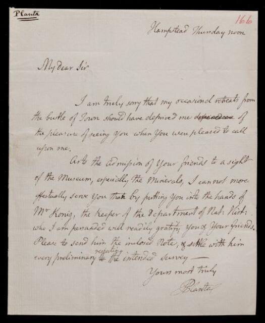 Joseph Planta, Letter, from Joseph Planta to Sir John Herschel, dated at Hampstead, HS/14/166, The Royal Society Archives, London, https://makingscience.royalsociety.org/items/hs_14_166/letter-from-joseph-planta-to-sir-john-herschel-dated-at-hampstead, accessed on 15 April 2026