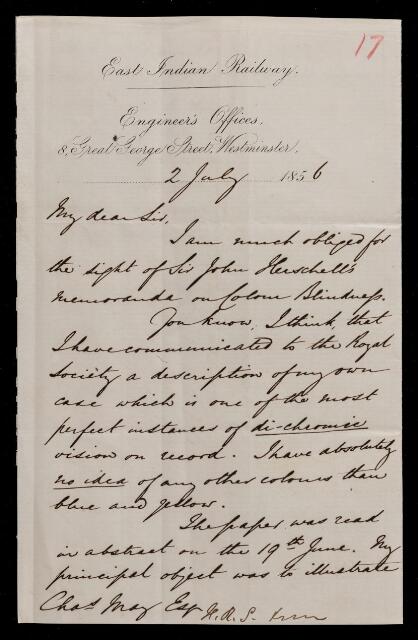 Autograph letter signed by sender. Claims himself perfect case of di-chromic vision, only seeing blue and yellow. Gave paper on his condition to Royal Society [of London], quoting and supporting John Frederick William Herschel's theory. Hears John Frederick William Herschel is ill, or would send letter directly to John Frederick William Herschel.