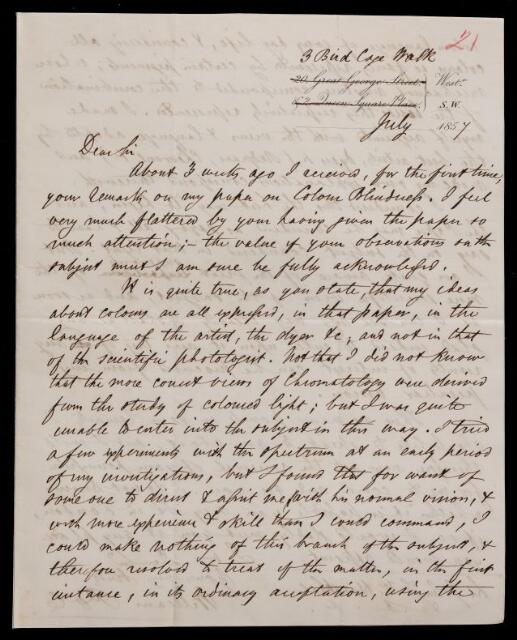 Autograph letter signed by sender. Explains why his paper on color vision took the artist, dyer, etc., point of view rather than that of scientific chromatology. Willing to investigate a more scientific approach and asks permission for another visit.