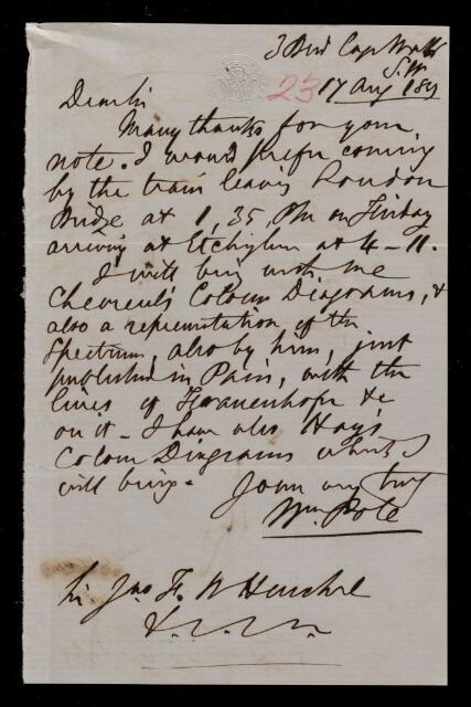Autograph letter signed by sender. Will bring [M. E.] Chevreul's color diagrams and new spectrum representation when he visits John Frederick William Herschel; confirms mode and date of arrival.