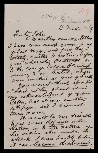 Autograph letter signed by sender. Notices in letter of last May John Frederick William Herschel's postscript about the rate of color blindness occurring to overworked or ill artists, and doubts it becomes di-chromic, but merely a 'weakness' of vision.