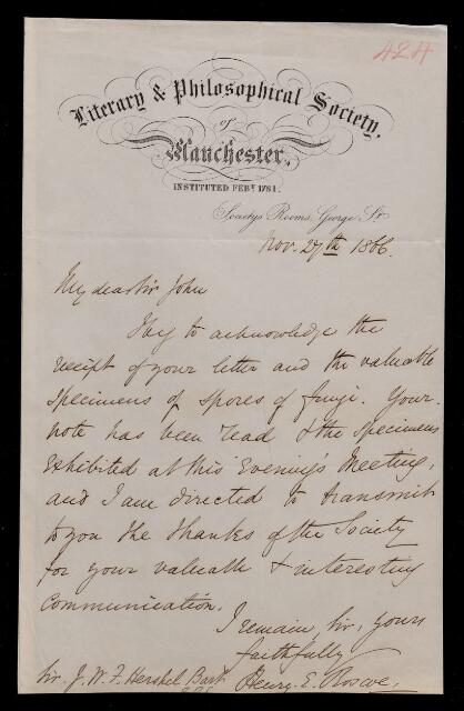 Letter, from Henry Enfield Roscoe to Sir John Herschel, dated at Manchester Literary and Philosophical Society