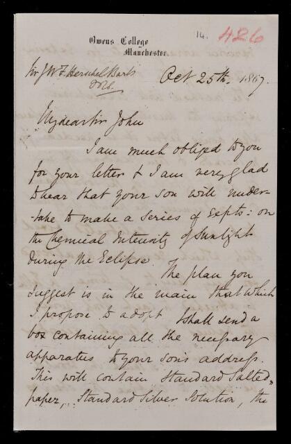 Letter, from Henry Enfield Roscoe to Sir John Herschel, dated at Owens College, Manchester
