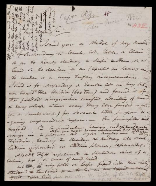 Draft letter. Describes method of suspending furniture in a ship such that the furniture is less influenced by the ship's motion.