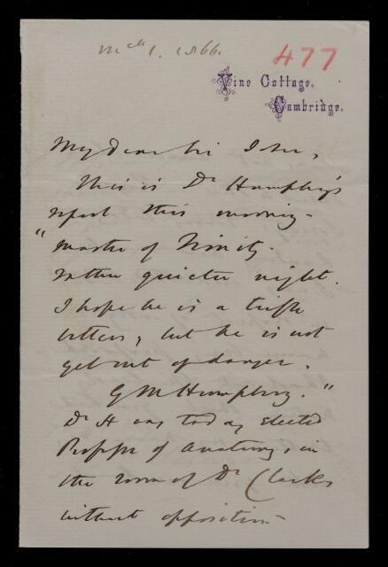 Letter, from William Selwyn to Sir John Herschel, dated at Vine Cottage, Cambridge