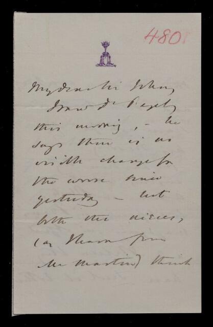 Autograph letter signed by sender. William Whewell's nieces have little hope for his recovery. Whewell is anxious about his article on Grote's Plato for MacMillan's Magazine.