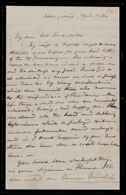 Autograph letter signed by sender. Thanks Mary Somerville for sympathy letter. Discusses present situation in Italy. Discusses his children and their scattered locations, e.g., a son fighting in the Indigo affair. Discusses his articles for Encyclopaedia Britannica.