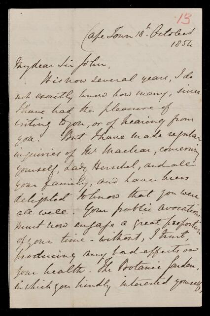 Autograph letter signed by sender. Describes the Cape Botanical Garden, which is finally opened. Congratulates John Frederick William Herschel on the marriage of John Frederick William Herschel's daughter [Caroline Emilia]. Copper mining in the colony successful. Will move to a new cottage.