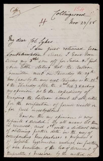 John Frederick William Herschel, Copy letter, from Sir John Herschel to William Henry Sykes, dated at Collingwood, 23 November 1858, HS/17/154, The Royal Society Archives, London, https://makingscience.royalsociety.org/items/hs_17_154/copy-letter-from-sir-john-herschel-to-william-henry-sykes-dated-at-collingwood, accessed on 17 March 2026