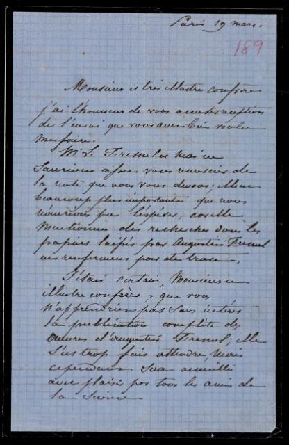 Autograph letter signed by sender. Thanks for help [see Henri de Senarmont's 1862-2-24]; requests John Frederick William Herschel's further assistance in publishing a complete edition of writings of Augustin Fresnel.
