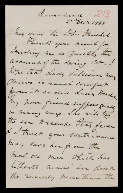 Autograph letter signed by sender. Thanks John Frederick William Herschel for sending plan of swing to counteract seasickness. This will enable his long suffering friend Lady Sullivan to escape hay fever by going to sea but without thereby being beset by seasickness.