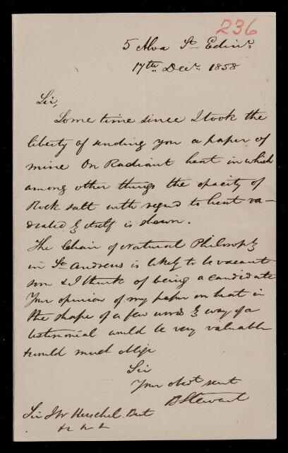 Balfour Stewart, Balfour Stewart, Letter, from Balfour Stewart to Sir John Herschel, dated at Alva St., Edinburgh, 17 December 1858, HS/17/236, The Royal Society Archives, London, https://makingscience.royalsociety.org/items/hs_17_236/letter-from-balfour-stewart-to-sir-john-herschel-dated-at-alva-st-edinburgh, accessed on 17 March 2026