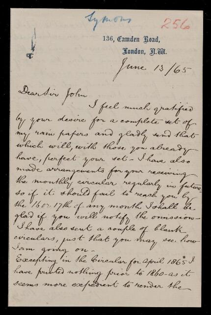 George James Symons, Letter, from George James Symons to Sir John Herschel, dated at 136 Camden Road, 13 June 1865, HS/17/256, The Royal Society Archives, London, https://makingscience.royalsociety.org/items/hs_17_256/letter-from-george-james-symons-to-sir-john-herschel-dated-at-136-camden-road, accessed on 09 March 2026