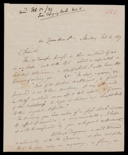 William Henry Fox Talbot, William Henry Fox Talbot, Letter, from William Henry Fox Talbot to Sir John Herschel, dated at 44 Queen Anne St., 11 February 1839, HS/17/282, The Royal Society Archives, London, https://makingscience.royalsociety.org/items/hs_17_282/letter-from-william-henry-fox-talbot-to-sir-john-herschel-dated-at-44-queen-anne-st, accessed on 08 March 2026