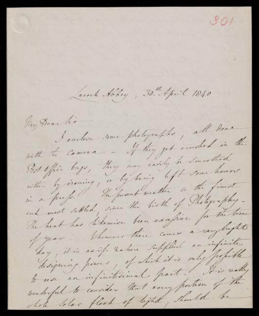 William Henry Fox Talbot, William Henry Fox Talbot, Letter, from William Henry Fox Talbot to Sir John Herschel, dated at Lacock Abbey, 30 April 1840, HS/17/301, The Royal Society Archives, London, https://makingscience.royalsociety.org/items/hs_17_301/letter-from-william-henry-fox-talbot-to-sir-john-herschel-dated-at-lacock-abbey, accessed on 12 February 2026