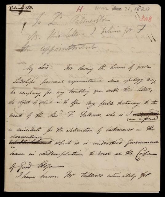 John Frederick William Herschel, Draft letter, from Sir John Herschel to Henry John Temple, dated at Slough, 31 March 1820, HS/17/343, The Royal Society Archives, London, https://makingscience.royalsociety.org/items/hs_17_343/draft-letter-from-sir-john-herschel-to-henry-john-temple-dated-at-slough, accessed on 07 February 2026