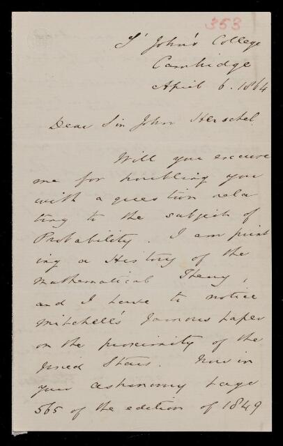 Isaac Todhunter, Letter, from Isaac Todhunter to Sir John Herschel, dated at St. John's, Cambridge, 6 April 1864, HS/17/353, The Royal Society Archives, London, https://makingscience.royalsociety.org/items/hs_17_353/letter-from-isaac-todhunter-to-sir-john-herschel-dated-at-st-johns-cambridge, accessed on 13 November 2025