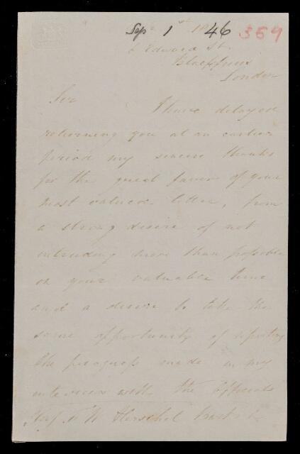 John Thomas Towson, Letter, from John T. Towson to Sir John Herschel, dated at Edward St., Blackfriars, 1 September 1846, HS/17/359, The Royal Society Archives, London, https://makingscience.royalsociety.org/items/hs_17_359/letter-from-john-t-towson-to-sir-john-herschel-dated-at-edward-st-blackfriars, accessed on 12 December 2025