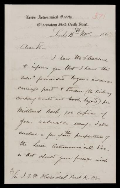 William [Jr.] Trant, Letter, from William Trant, Jr. to Sir John Herschel, dated at Leeds Astronomical Society, 16 November 1863, HS/17/371, The Royal Society Archives, London, https://makingscience.royalsociety.org/items/hs_17_371/letter-from-william-trant-jr-to-sir-john-herschel-dated-at-leeds-astronomical-society, accessed on 12 December 2025