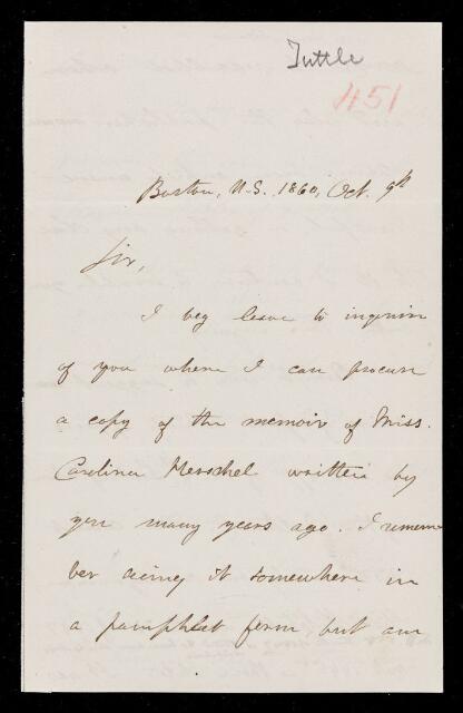 Charles Wesley Tuttle, Letter, from Charles W. Tuttle to Sir John Herschel, dated at Boston, Mass., 9 October 1860, HS/17/451, The Royal Society Archives, London, https://makingscience.royalsociety.org/items/hs_17_451/letter-from-charles-w-tuttle-to-sir-john-herschel-dated-at-boston-mass, accessed on 06 February 2026