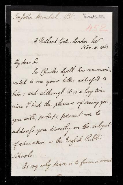 Edward Turner Boyd Twisleton, Letter, from Edward Twisleton to Sir John Herschel, dated at 3 Rutland Gate, 8 November 1862, HS/17/452, The Royal Society Archives, London, https://makingscience.royalsociety.org/items/hs_17_452/letter-from-edward-twisleton-to-sir-john-herschel-dated-at-3-rutland-gate, accessed on 05 March 2026