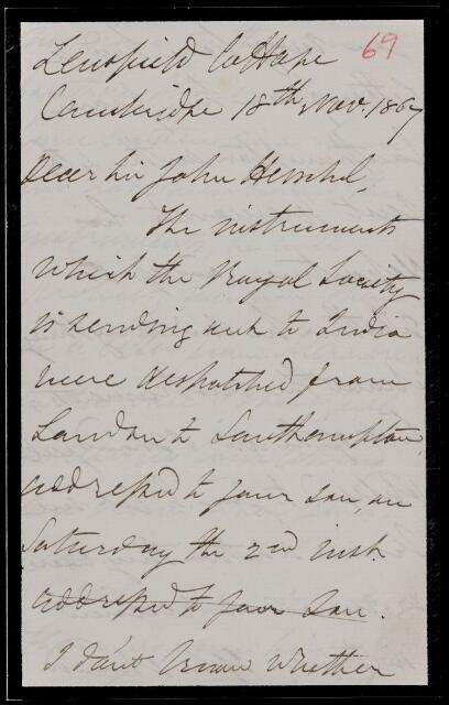Autograph letter signed by sender. About some instruments to be taken to India by John Frederick William Herschel's son John.