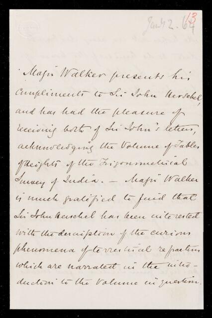 James Thomas Walker, Letter, from James Thomas Walker to Sir John Herschel, dated at 24 Blessington Road, Lee, Blackheath, 2 January 1864, HS/18/13, The Royal Society Archives, London, https://makingscience.royalsociety.org/items/hs_18_13/letter-from-james-thomas-walker-to-sir-john-herschel-dated-at-24-blessington-road-lee-blackheath, accessed on 08 November 2025