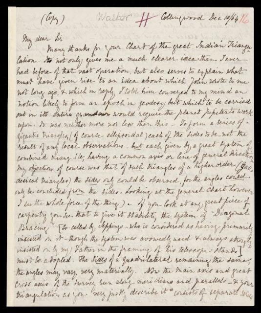 John Frederick William Herschel, Copy letter, from Sir John Herschel to James Thomas Walker, dated at Collingwood, 10 December 1864, HS/18/16, The Royal Society Archives, London, https://makingscience.royalsociety.org/items/hs_18_16/copy-letter-from-sir-john-herschel-to-james-thomas-walker-dated-at-collingwood, accessed on 05 March 2026